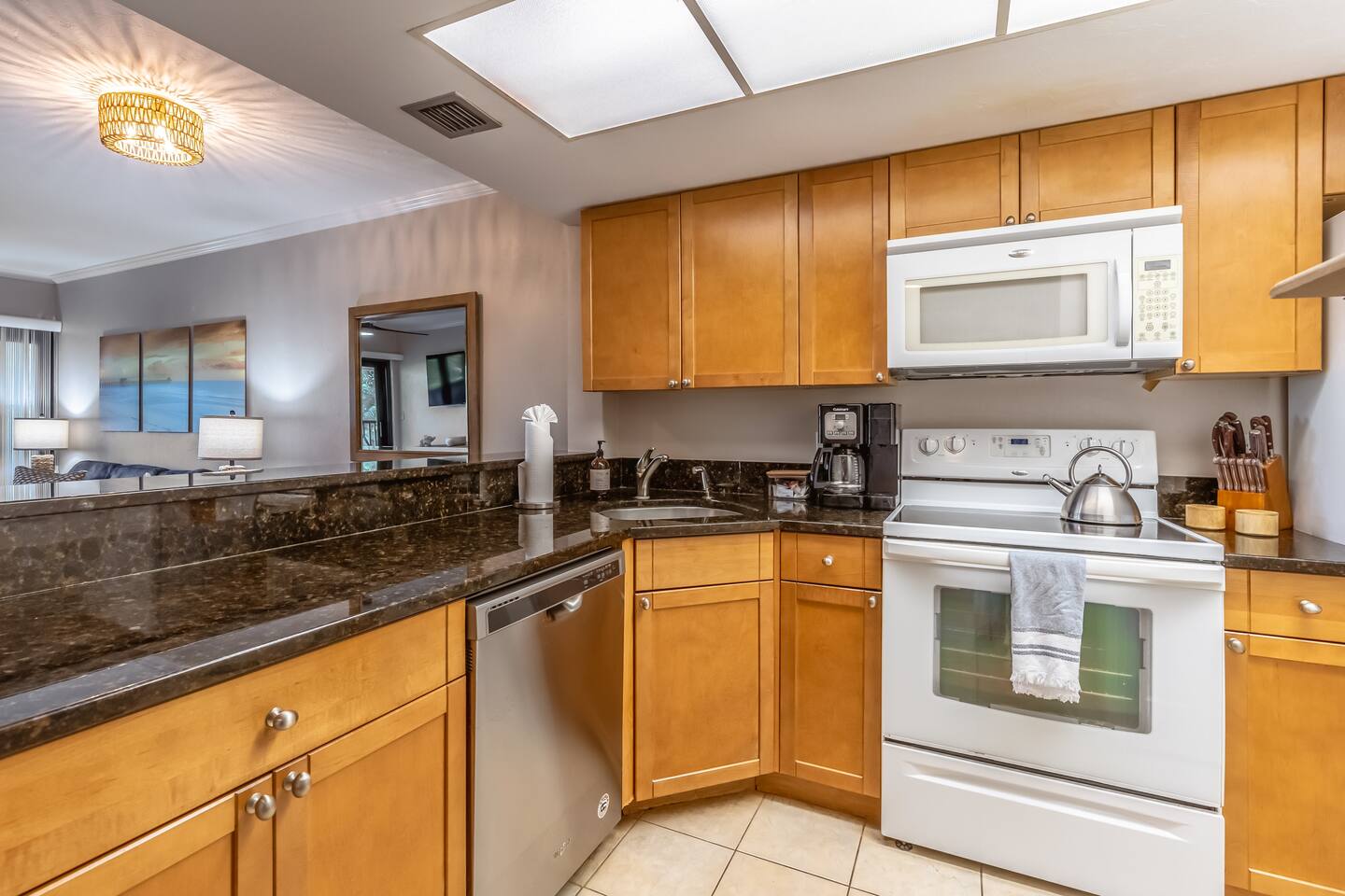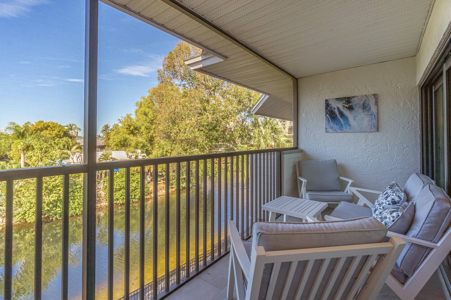 The condo features an open and airy living space designed for comfort and relaxation. The living room offers comfortable seating and opens directly to a private screened patio with lake and pool views, making it an ideal spot for morning coffee or evening sunsets. The fully equipped kitchen is updated and functional, with everything needed for preparing meals during your stay. The dining area is conveniently located between the kitchen and living room and provides seating for casual dining. The primary bedroom includes a comfortable king bed and an en-suite bathroom, offering a quiet retreat at the end of the day. The second bedroom is thoughtfully arranged with two twin beds, ideal for family or guests, and has easy access to the second full bathroom. A pull-out sofa in the living area provides additional sleeping space when needed. The condo also includes an in-unit washer and dryer for added convenience, along with elevator access to the third floor. Every space is arranged with attention to detail to ensure a clean, comfortable, and easy stay - whether you’re here for a long weekend or an extended visit.